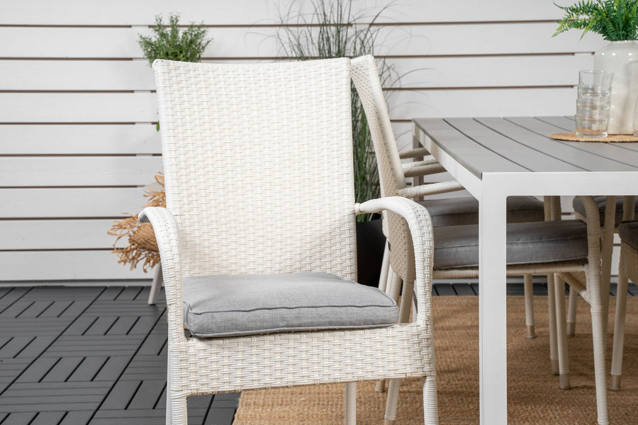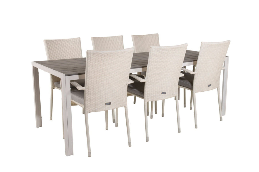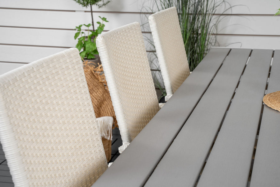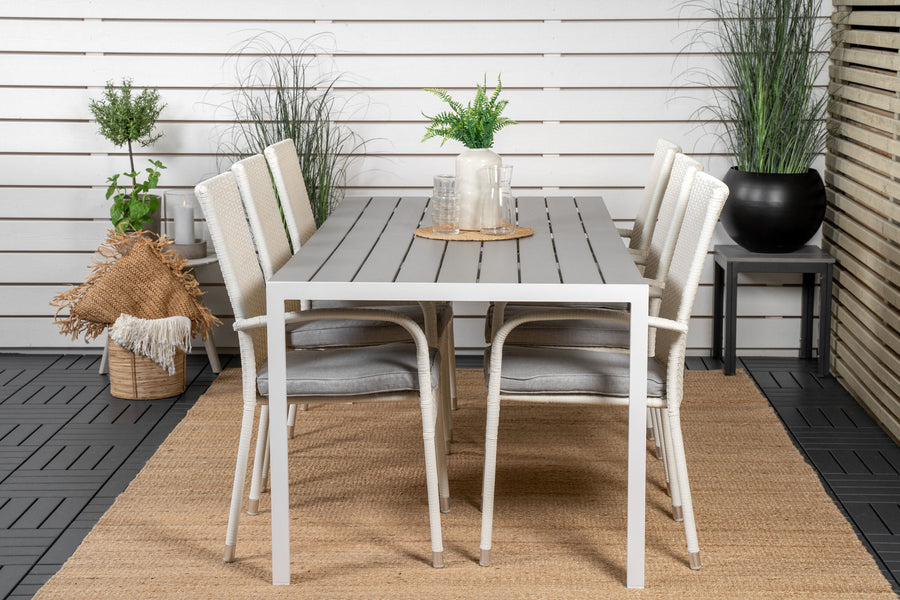 Rikkoutunut ruokapöytä 205*90 - valkoinen alumiini / harmaa aintwood + Anna kehystuoli - valkoinen